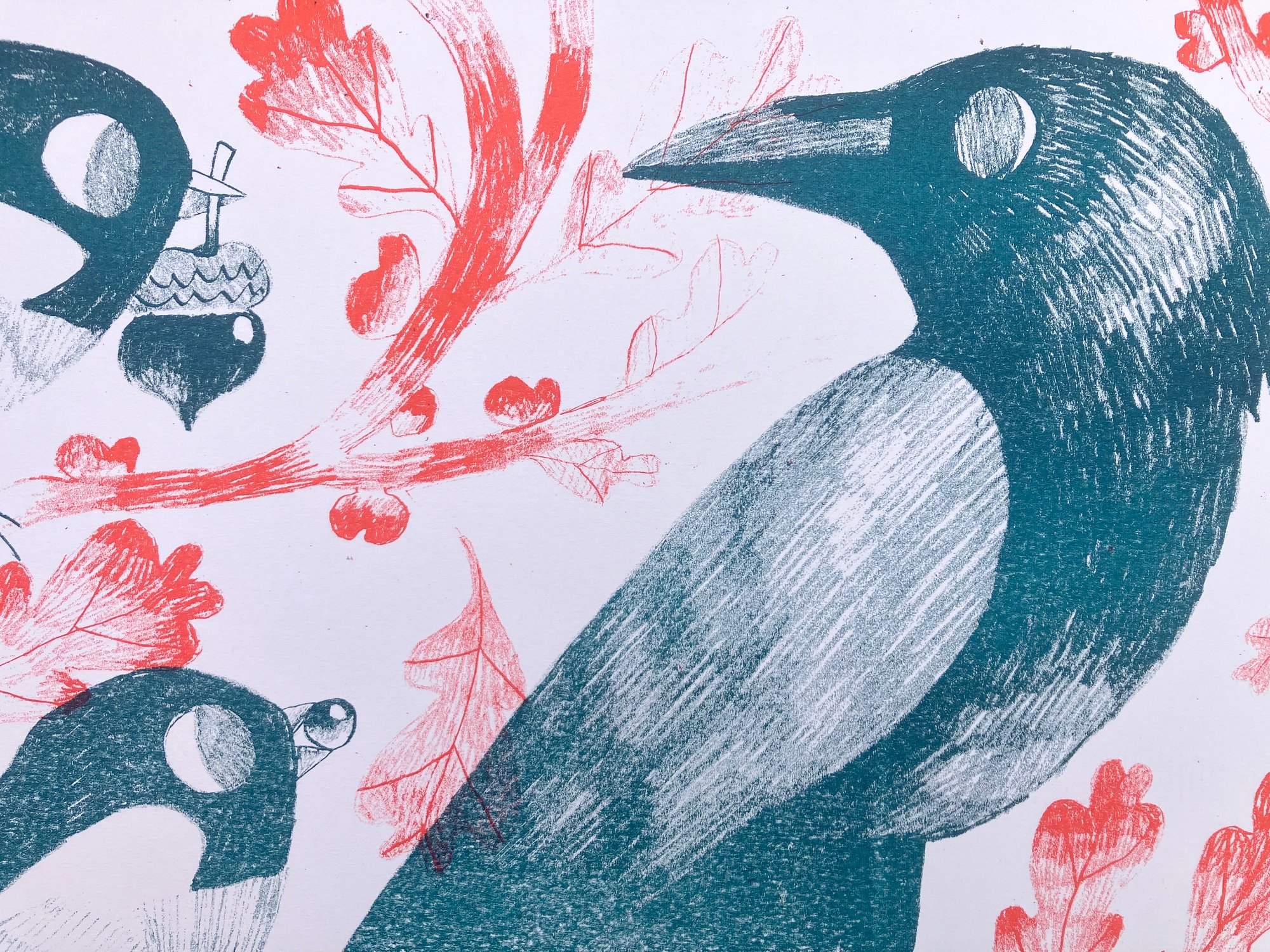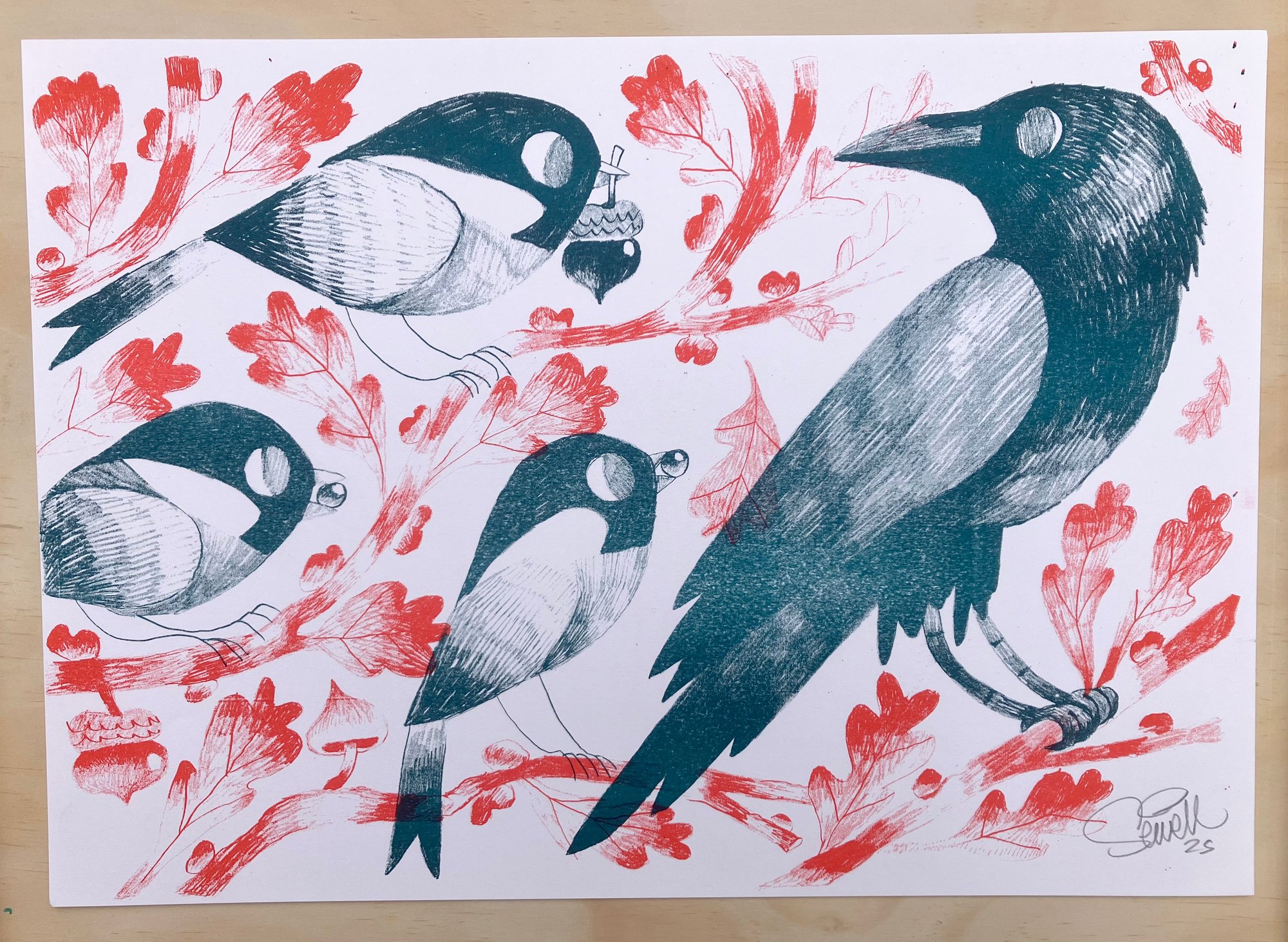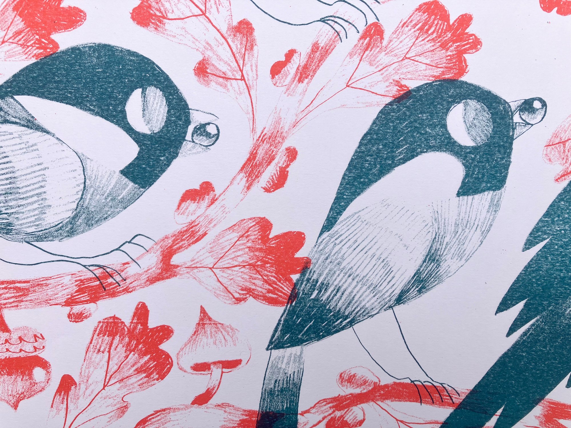 This is a handmade/drawn Riso print. Things can get a bit squiffy with a Riso, the odd blemish, smudge, fingerprint or misalignment are all part of the charm.
